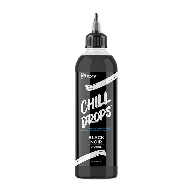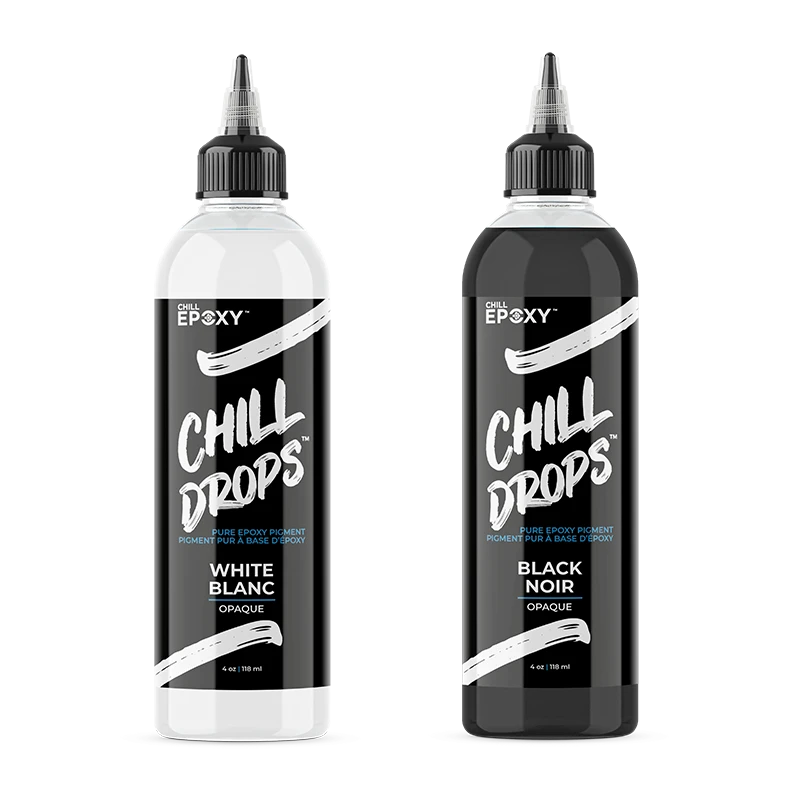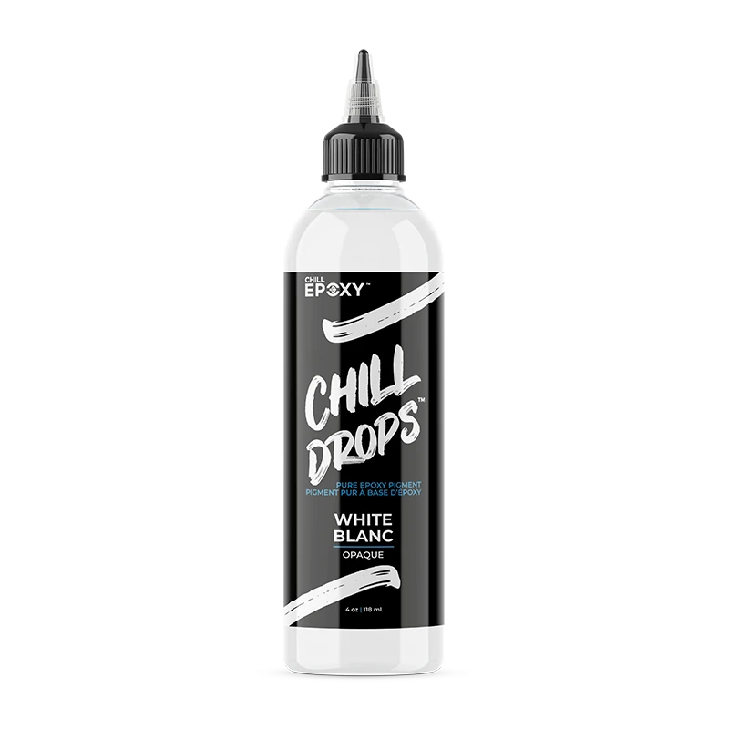 Liquid epoxy resin CHILL DROPS⢠has highly concentrated 100% reactive epoxy-based liquid pigments available in OPAQUE or TRANSPARENT options. Completely compatible with the CHILL EPOXY⢠line of products or other epoxy lines, they will allow you to achieve pure colors by using gradually between 0.0250% up to 5% in weight/volume in the mixture A/B until you reach the desired color.Â
