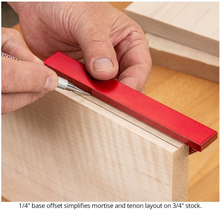 Easily lay out your project with the DelVe Square’s array of references. The base is offset with 3/8″ and 1/4″ on either side of the blade which is perfect for 3/4″ stock. You can easily mark 1/4″ from both edges for a mortise or tenon, or flip it around to the 3/8″ leg and quickly find dead centre. The DelVe Square’s base wraps around your workpiece making it simple to mark both the face and edge at the same time.