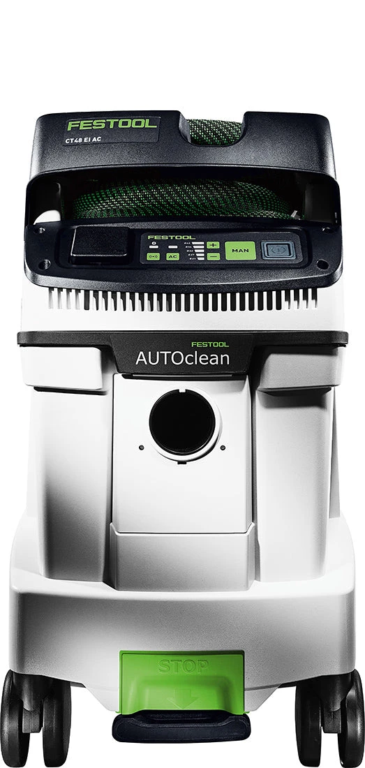 The CLEANTEC CT 48 EI AC features enhanced AUTOCLEAN main filter cleaning compared to its predecessor, ensuring consistently high suction power, longer working intervals, and an extended filter lifespan with reduced maintenance. It offers intuitive push-summary controls for easy operation and includes a built-in Bluetooth® interface, allowing you to start the extractor with a Festool cordless tool or an optional remote control. You can also connect it to the Festool app to set cleaning intervals and manage other functions. The smooth, anti-static suction hose can be conveniently stored in the integrated hose garage.