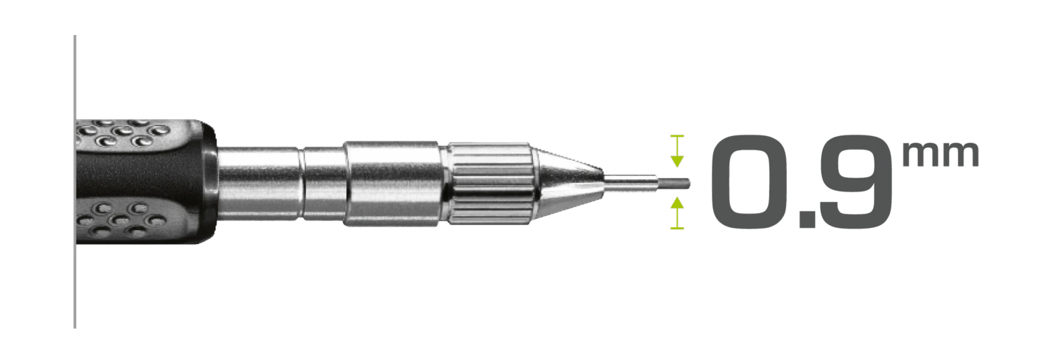 Ideal for fine and precise marking, without sharpening thanks to special lead diameter of only 0.9 mm. Not suitable for smooth and glossy surfaces