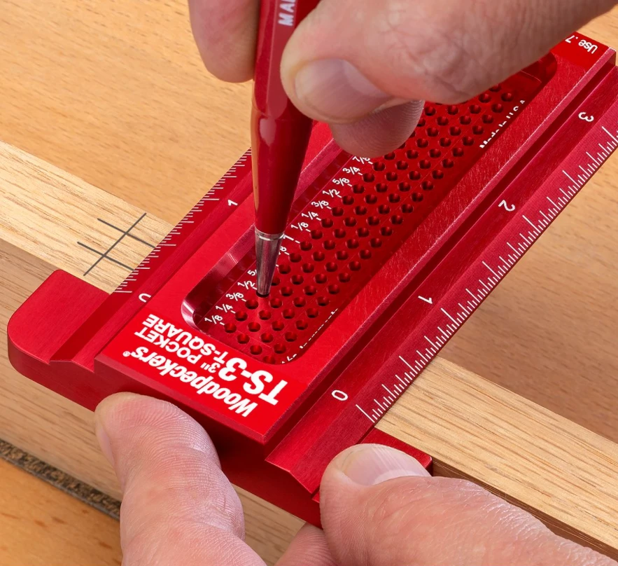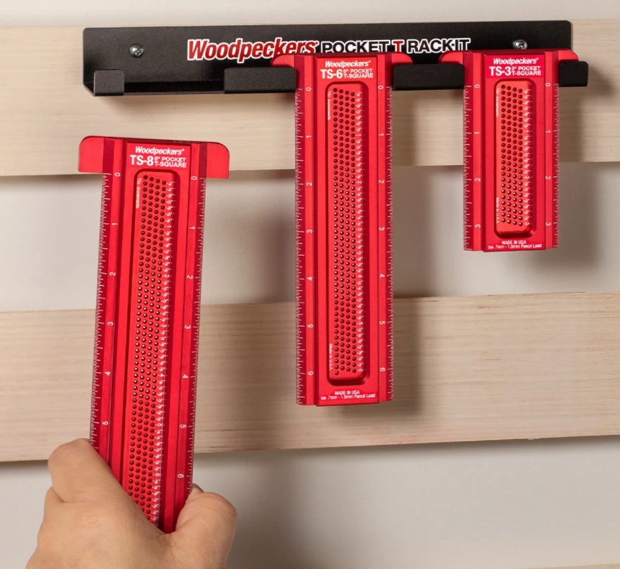 The Woodpeckers Pocket T-Squares simplify joinery layout and deliver exceptional accuracy. Whether you’re laying out mortises, tenons, and rabbets or marking the location of hinges and other cabinet hardware, these innovative Pocket T-Squares ensure the precision you need. Laying out lines at exact locations is as simple as putting your pencil in the right hole and sliding along the work piece edge. Adding to their effectiveness, these handy tools are compact enough to have one at hand whenever you’re in your shop.