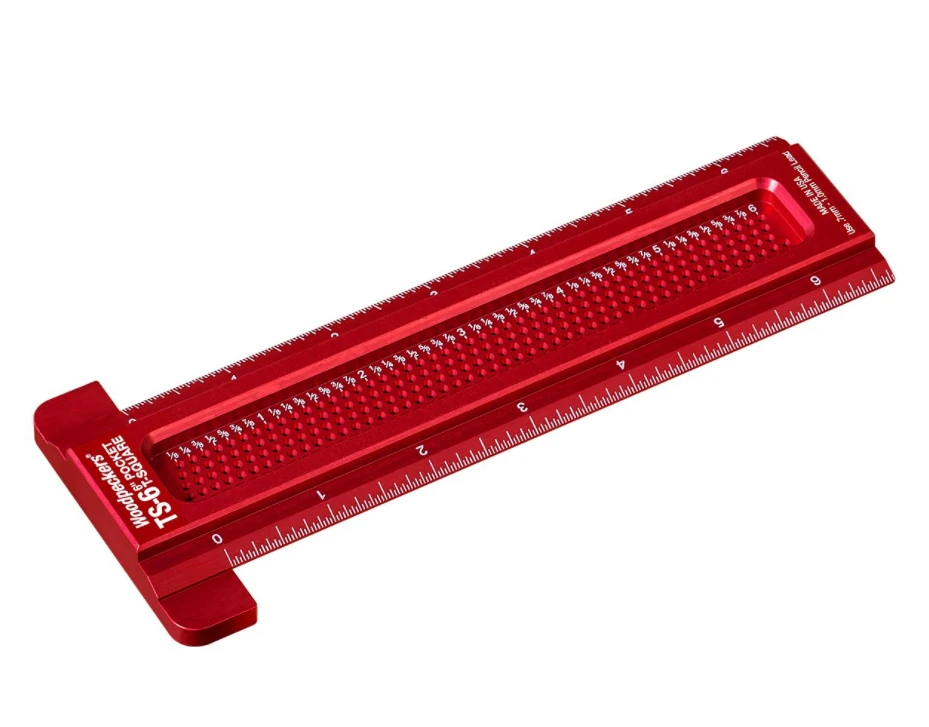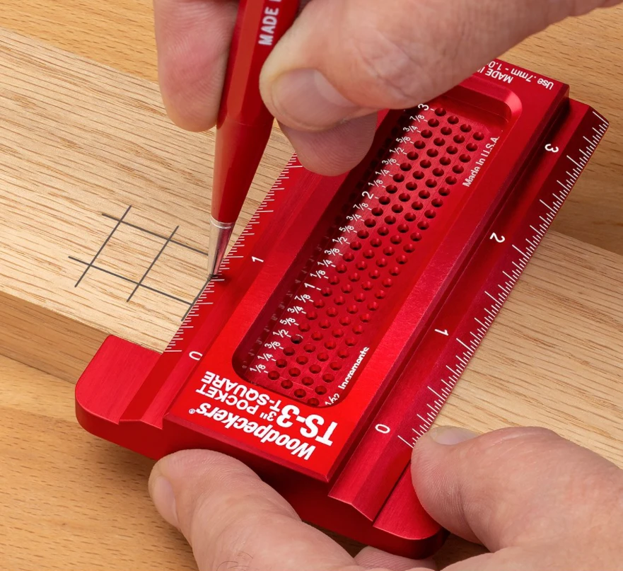 These Pocket T-Squares are milled from a single, solid billet of aluminum-for uncomprising rigidity. A broad, precisely machined lip registers solidly along your refernce edge. Both graduated edges are beveled to minimize parallax viewing error and get the graduations right down to your stock – where they belong. Best of all, the blades are precision drilled with a staggered series of holes 1/32nd of an inch apart. Each hole is 1mm in diameter – just right to fit the tip of a .7mm or .9mm mechanical pencil. Just drop the point of your mechanical pencil into the proper hole and glide along, guided by the edge of your stock. If you prefer metric measurements, they make the same tool with the holes drilled at precise 1mm spacing. With either calibration, the staggered layout of the guide holes maintains the integrity of the square’s body and makes it easy to select the proper measurement.