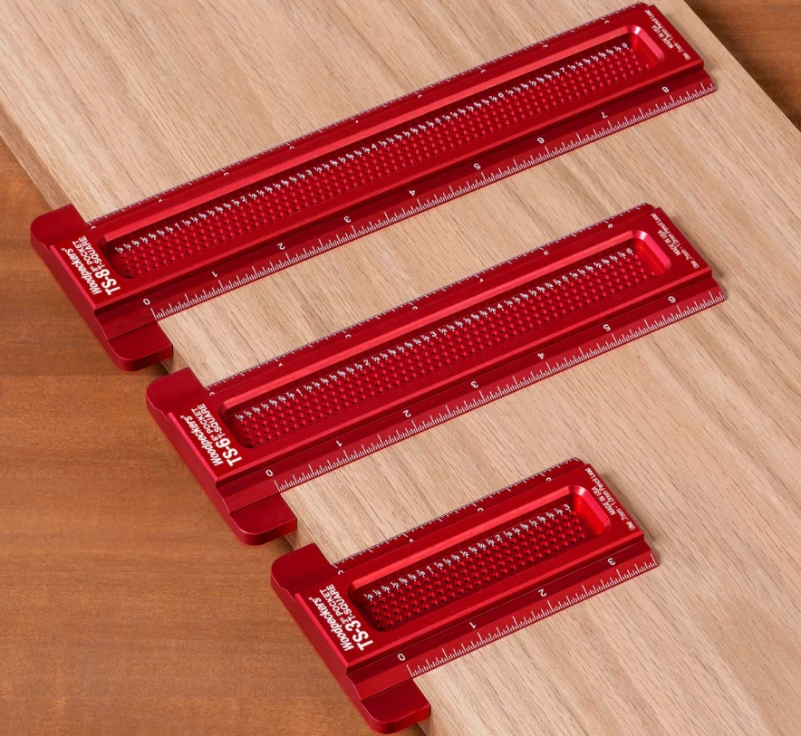 The Pocket T-Squares come in lengths of 3″, 6″, 8″ with 1/32″ graduations and guide holes – plus 75mm, 150mm, 200mm metric versions with 1mm graduations and guide holes. The 3″ and 75mm models are perfect for joinery layout and fit conveniently in your shirt or jeans pocket. For hardware placement and general layout work, the longer models give you more reach and still are easy to carry around.